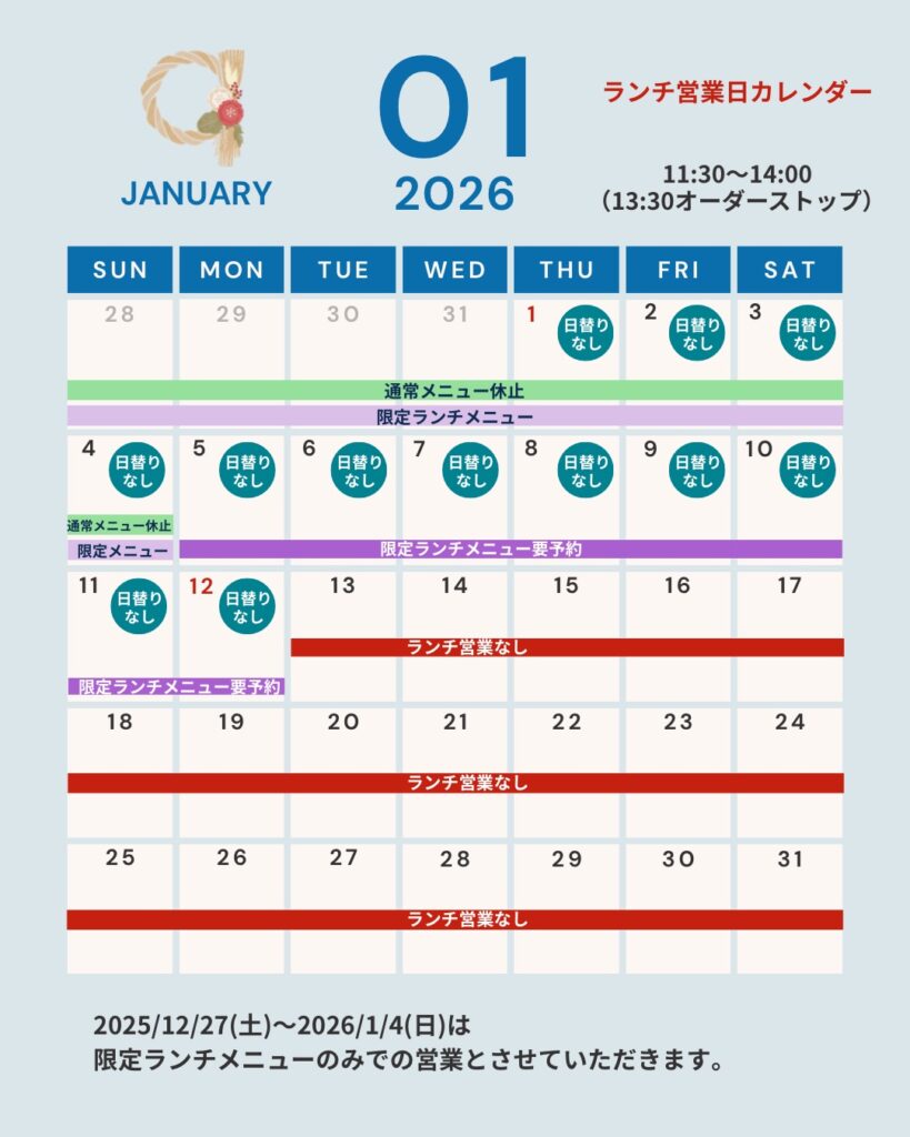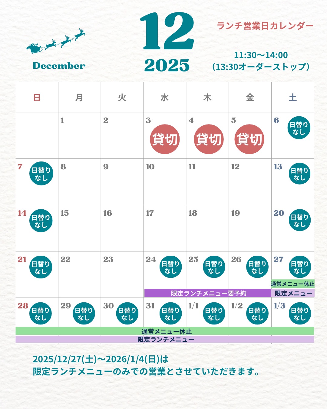 12月27日(土)~1月4日(日)は限定メニューのみのご案内になります。