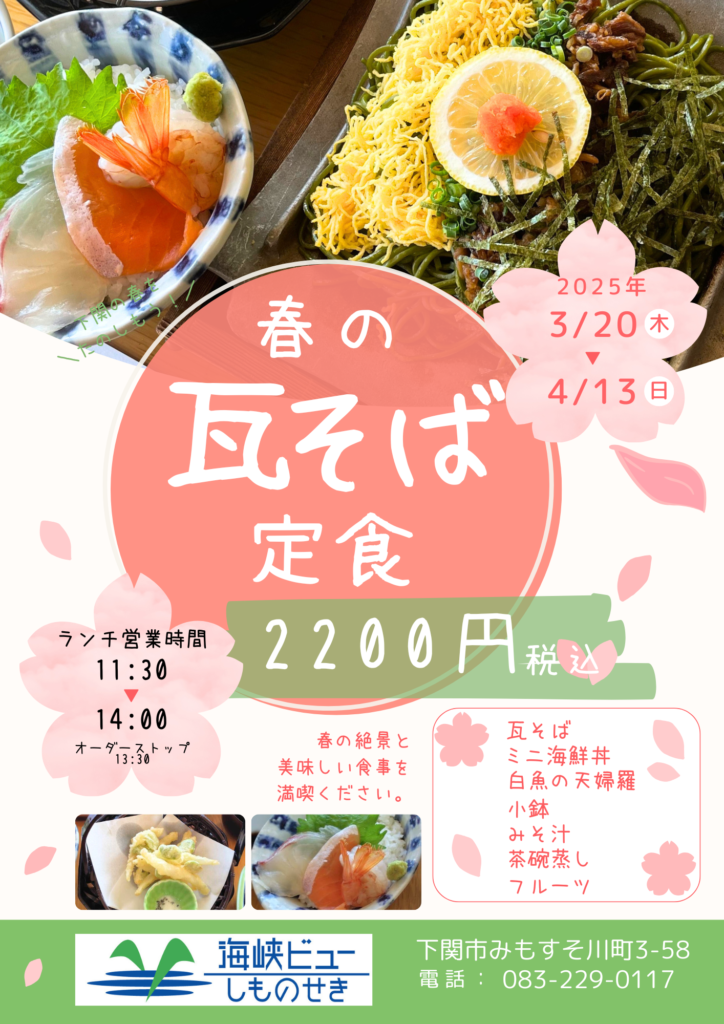 令和7年3月20日(木)~令和4月13日(日)の期間の特別ランチメニューをご紹介いたします。 期間限定で『窓際確約プラン』もありますのでぜひお問い合わせください。 大人数様でのご利用も可能でございます。 海峡ビューからの桜と関門海峡のコラボは圧巻ですよ。 ※お席のご予約状況によっては急遽貸切営業となる場合がありますので、お席のご予約をおすすめいたします。 ぜひ、絶景ランチをお楽しみください。